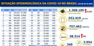 Covid-19: Brasil registra mais 692 óbitos e 24.052 casos