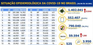 Brasil passa de 1,4 milhão de casos confirmados de Covid-19; 59.594...