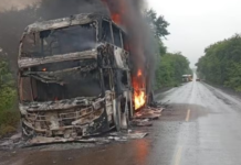 Ônibus pega fogo na MGC-122, no Norte de Minas
