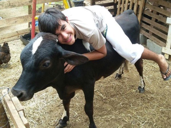 “Trouxemos ele em uma caminhonete. Ele cabia dentro de um saco de ração e batia em meu joelho de tão pequenininho. E eu trouxe ele para a horta, onde era um curralzinho. Meu pai ajudava a dar leite. A princípio era para o Tufão ficar aqui em casa para apenas amamentar, mas aí fomos pegando amor com ele, e hoje ele não sai mais de casa”, disse o estudante.
